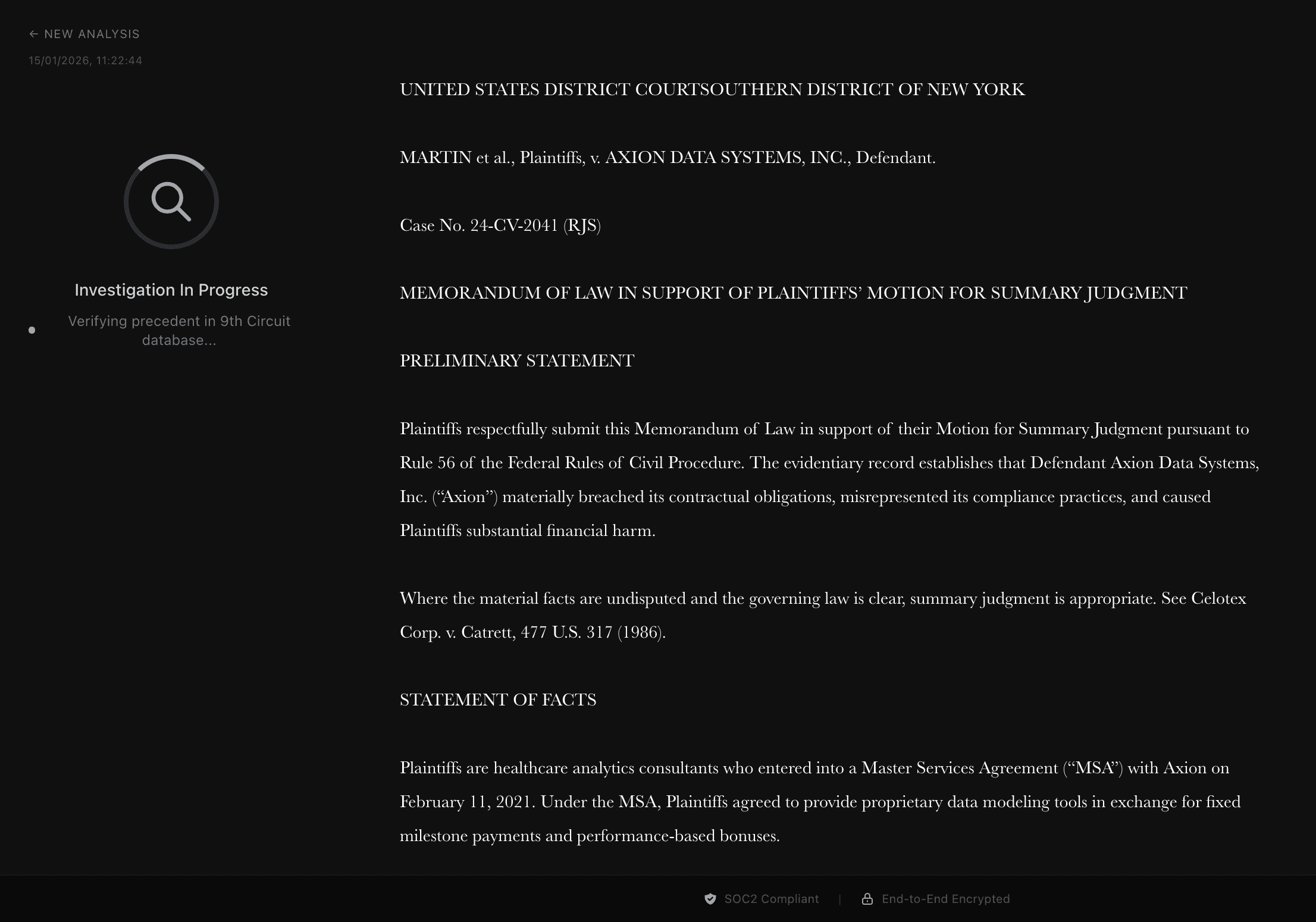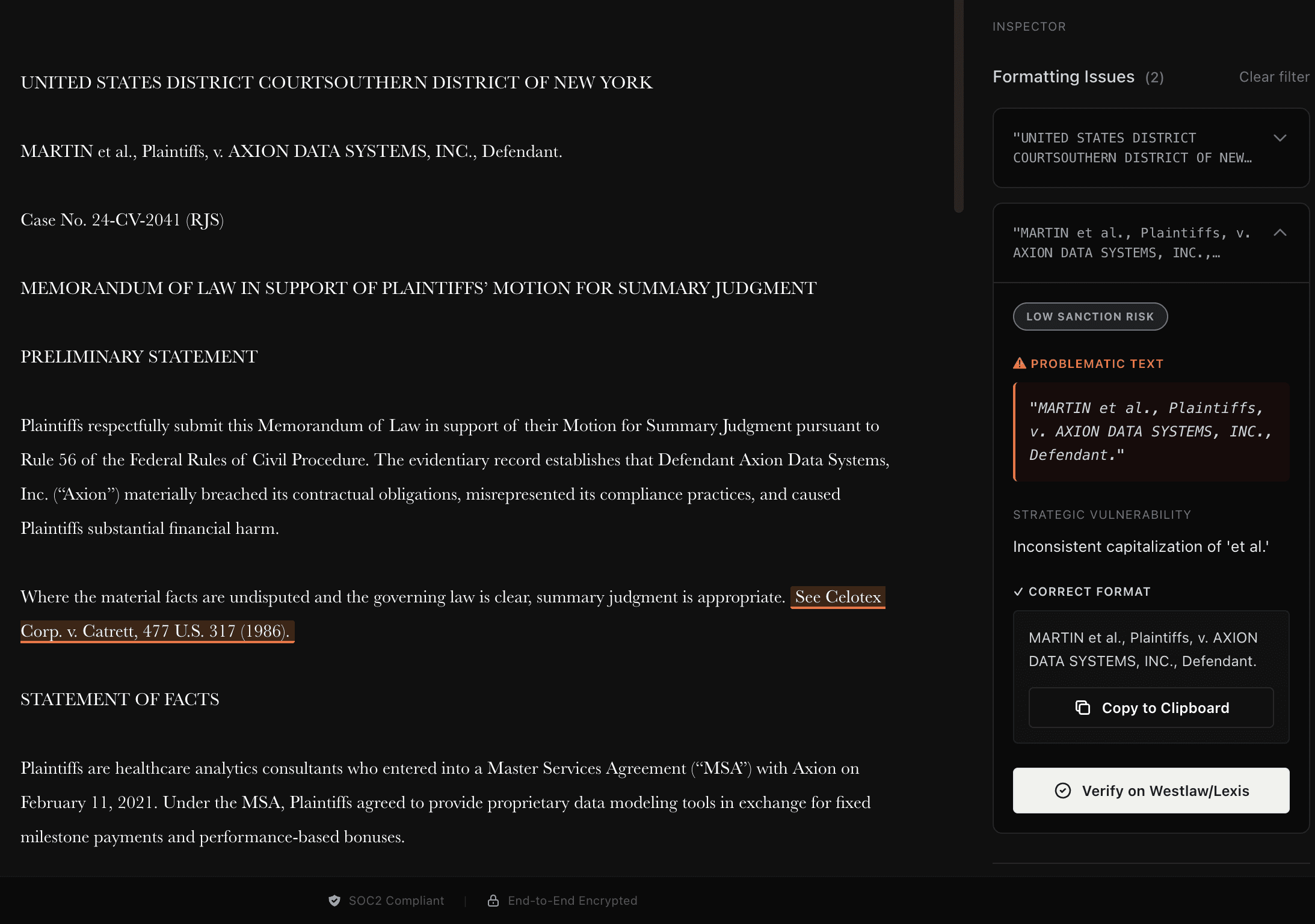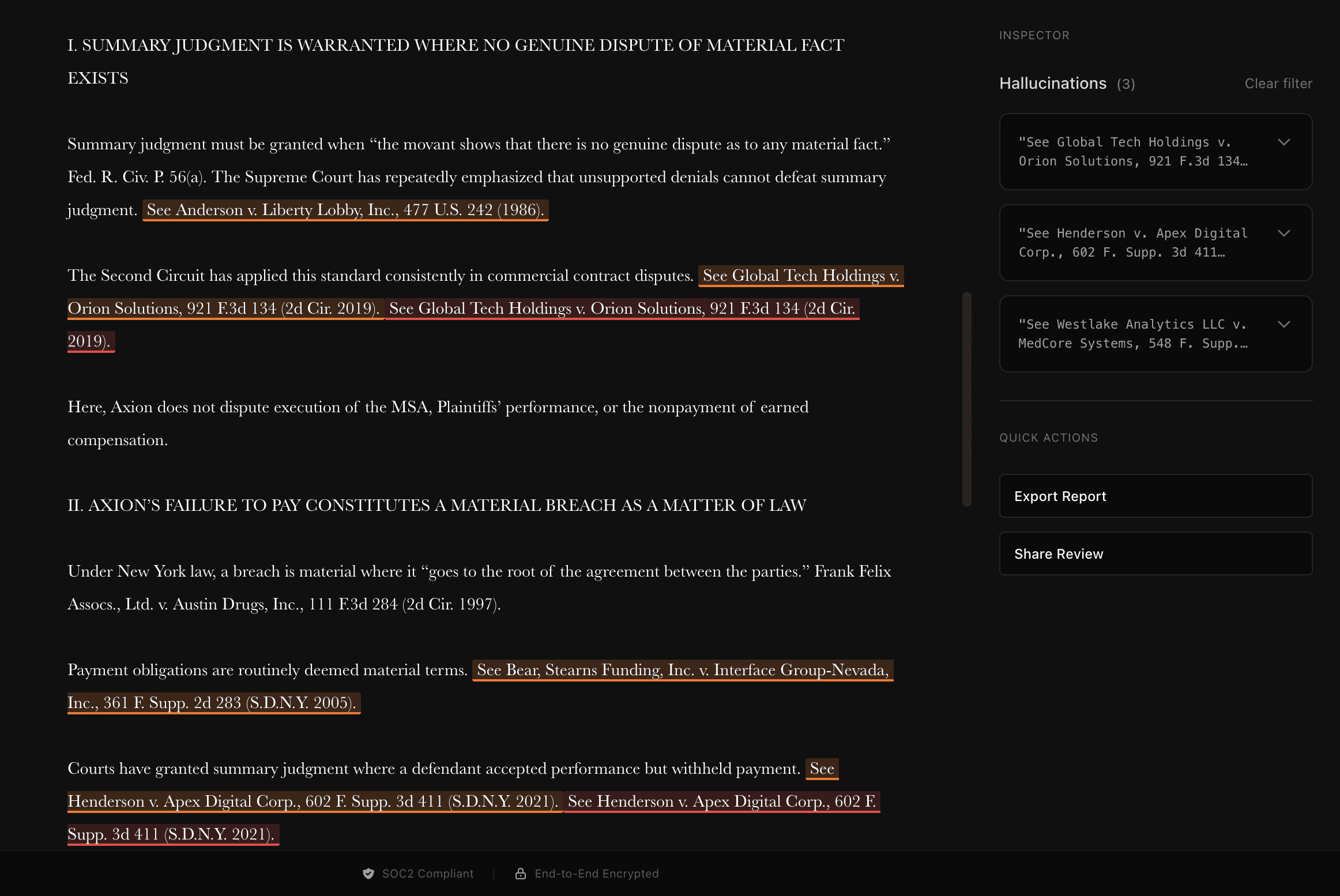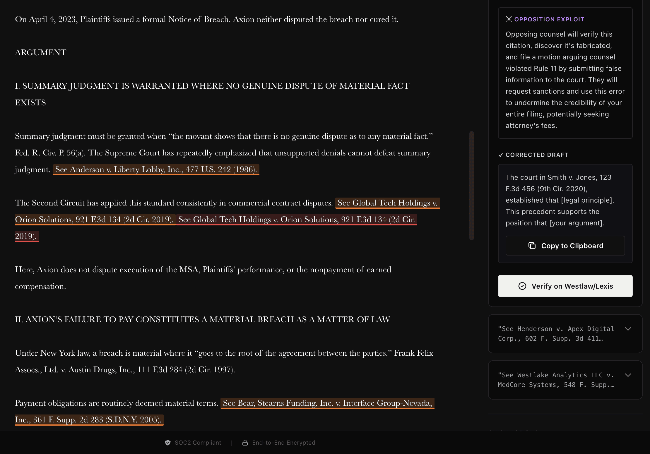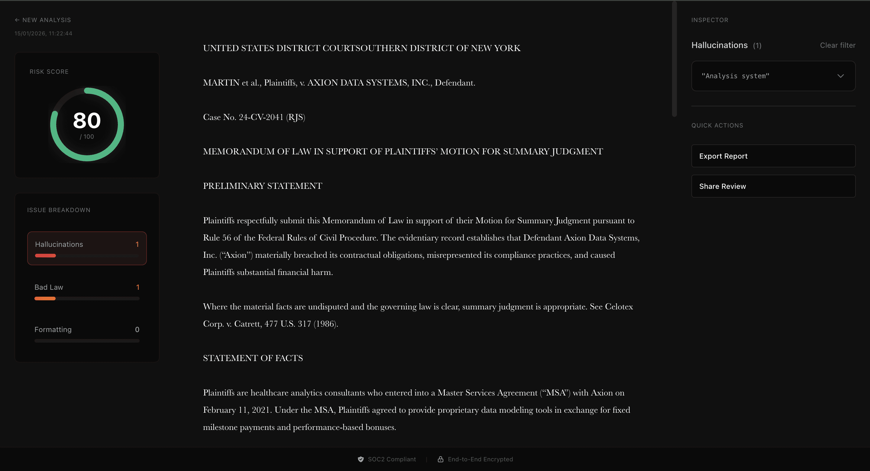 Surfaces litigation risk before a brief is filed